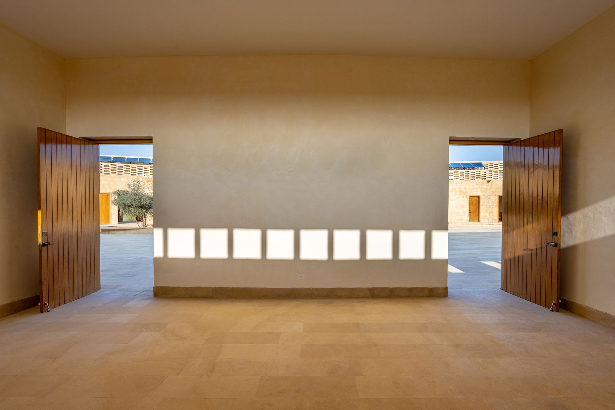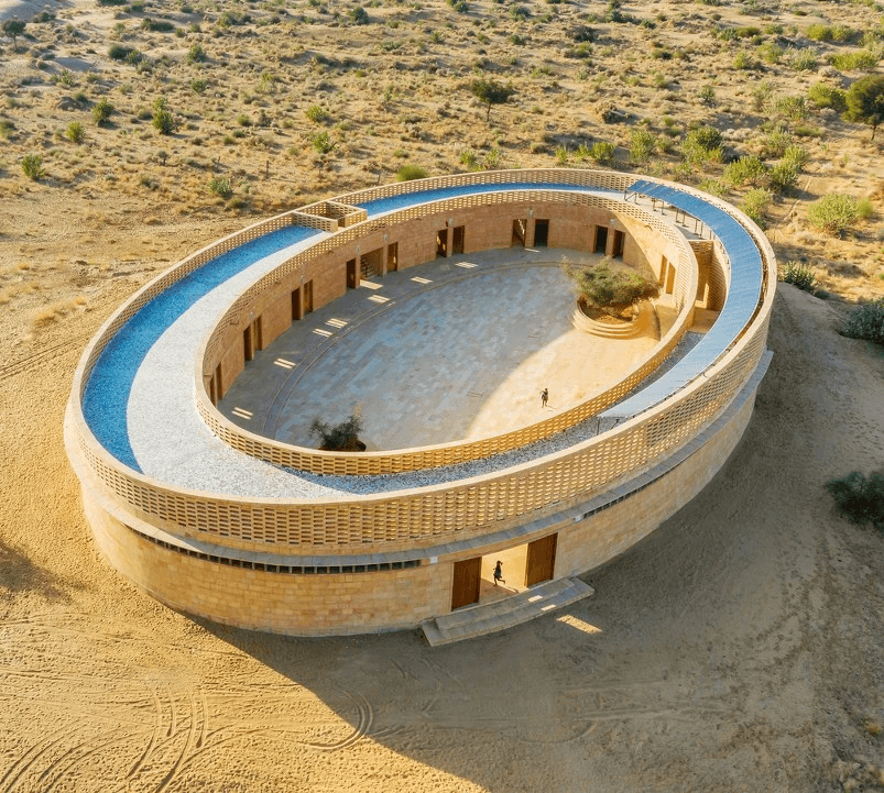 The school’s elliptical sandstone form and perforated jali screens filter harsh desert sunlight into diffused interior radiance. Rather than allowing light to flood the space indiscriminately, the architecture tempers and directs it to balance glare reduction, thermal control, and atmospheric effect.