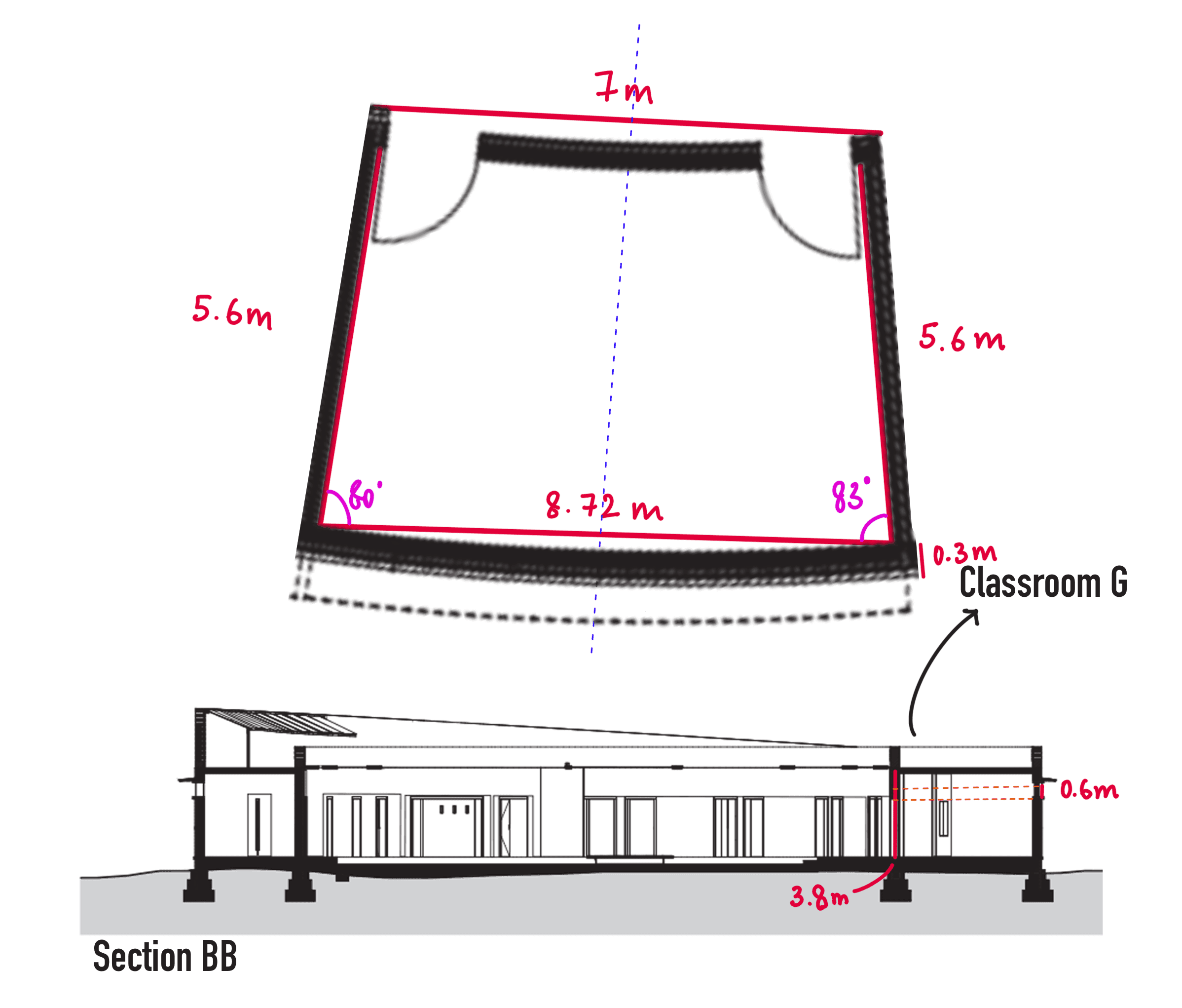 To highlight this occasion, I focused on Classroom G, which is oriented at a 70° angle to the N-S axis. The building height was adjusted to be 0.6 meters taller than its original design, with the windows lowered by the same amount. This configuration ensures that at 7:40 am on January 24th, sunlight enters the windows at an angle of 0° (parallel to the horizontal), projecting a beam at the same height as the windows on the opposite side.